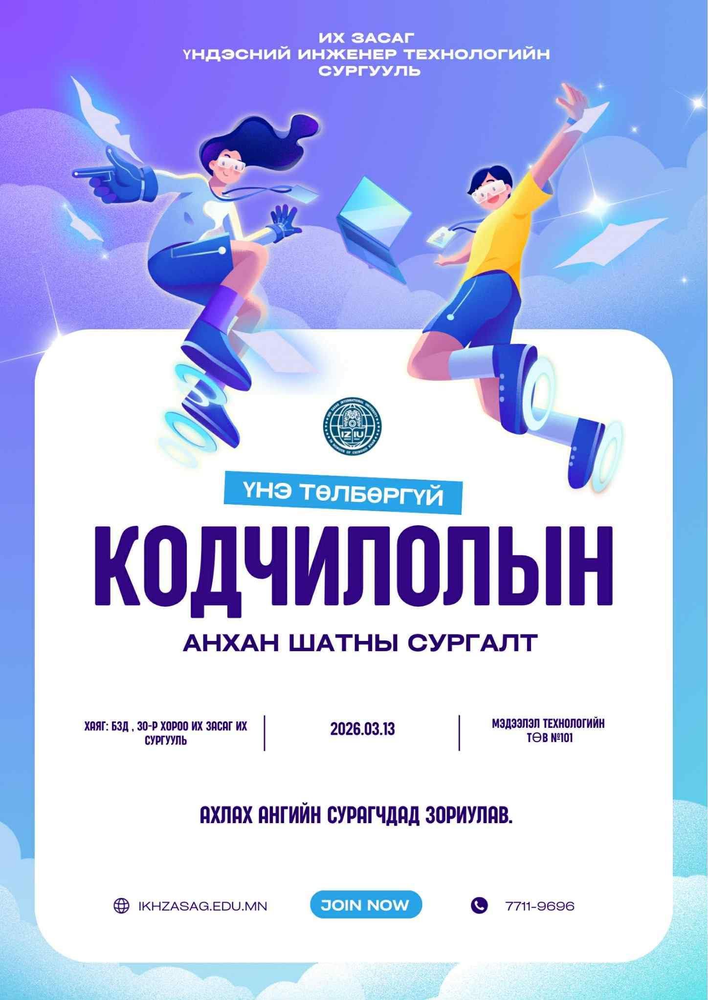 Их Засаг Их Сургууль-ийн Үндэсний Инженер Технологийн сургуулиас ахлах ангийн сурагчдад зориулсан “Кодчилолын анхан шатны сургалт”-ыг үнэ төлбөргүй зохион байгуулах гэж байна.