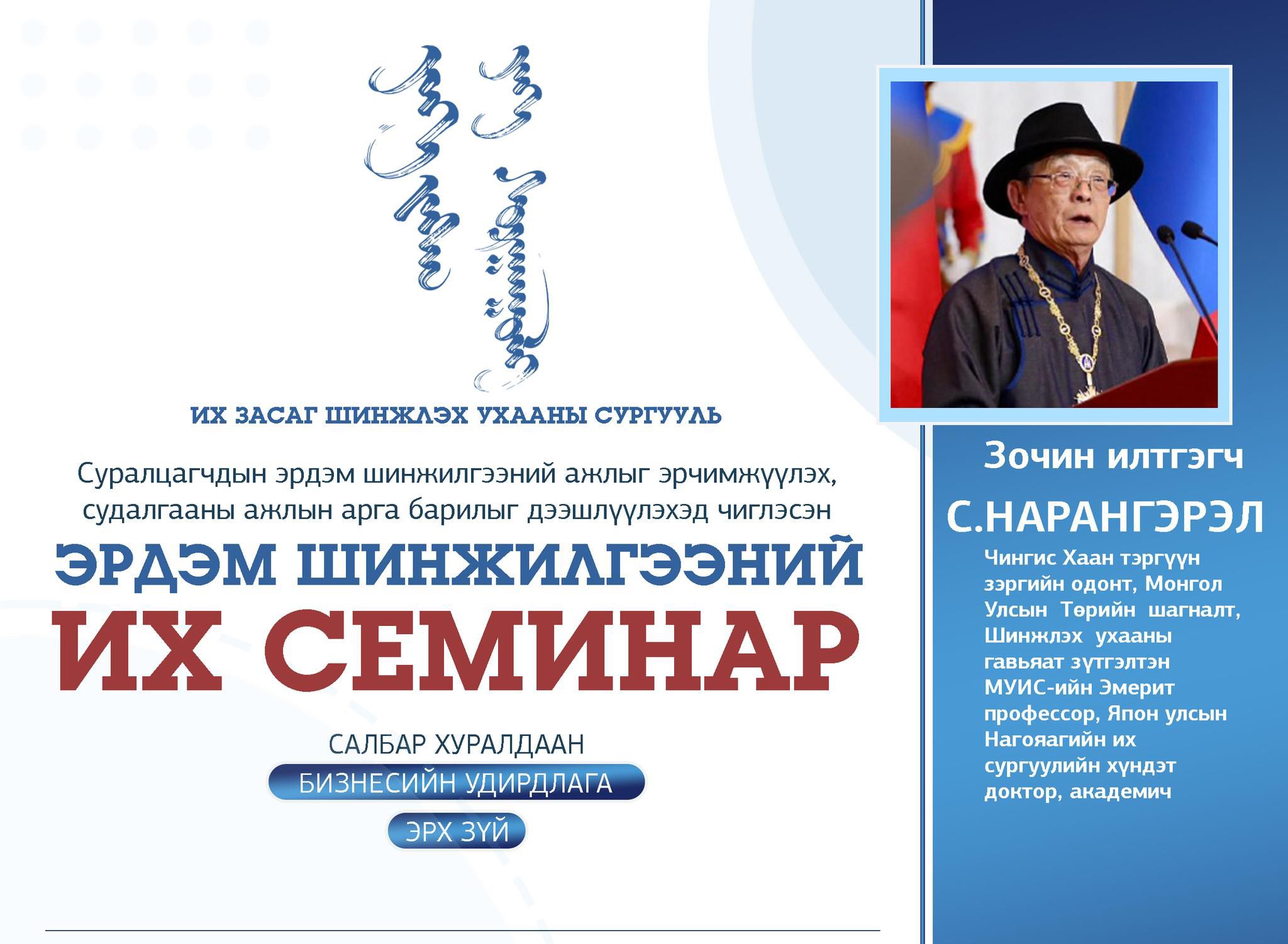 Тус семинарт Их Засаг Их Сургууль-ийн удирдлагууд оролцсоноос гадна зочин илтгэгчээр С.Нарангэрэл хүрэлцэн ирж, “Хүмүүн байхын учир ёс суртахуунд оршвой” сэдэвт лекц уншлаа.