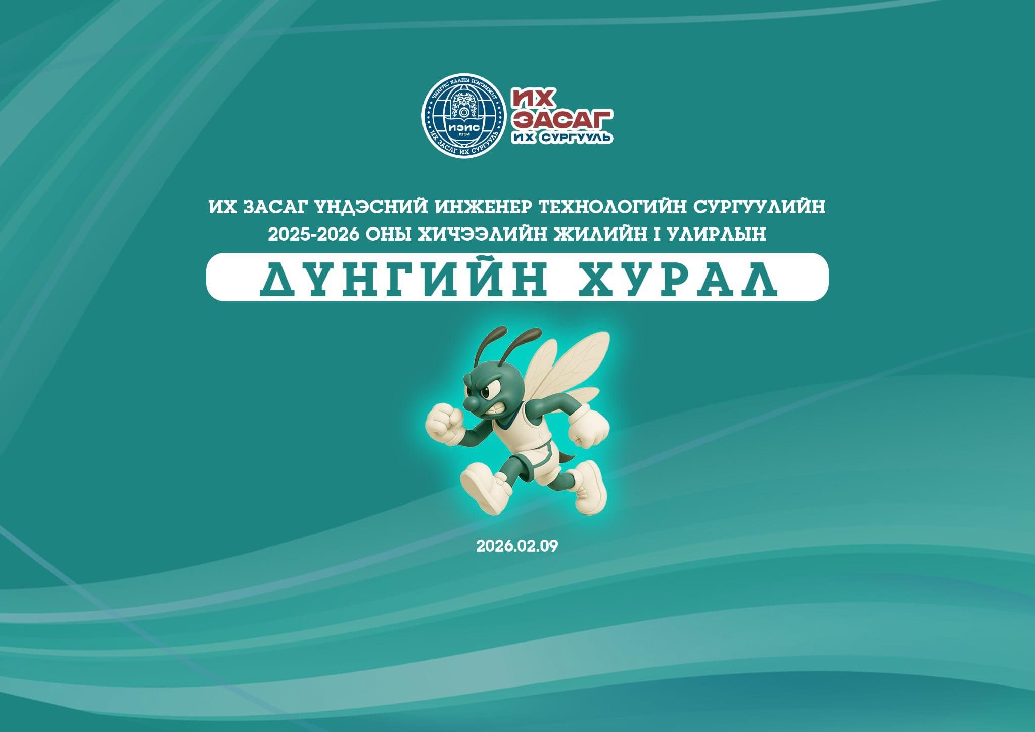 Их Засаг Үндэсний Инженер Технологийн Сургуулийн 2025–2026 оны хичээлийн жилийн I улирлын Дүнгийн хурал 2026 оны 02 дугаар сарын 09-ний өдрийн 11:30 цагт Их Засаг спорт зааланд зохион байгуулагдана.