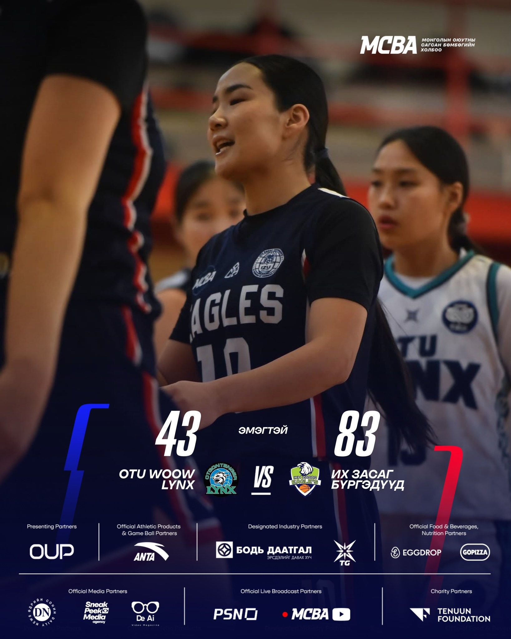 Тус тоглолтод ИХ ЗАСАГ БҮРГЭДҮҮД баг OTU WOOW LYNX багийг 83:43 харьцаатайгаар илт давамгай ялж, талбай дээрх хүч чадал, зохион байгуулалт, багийн уялдаа холбоогоо бүрэн харуулсан юм.