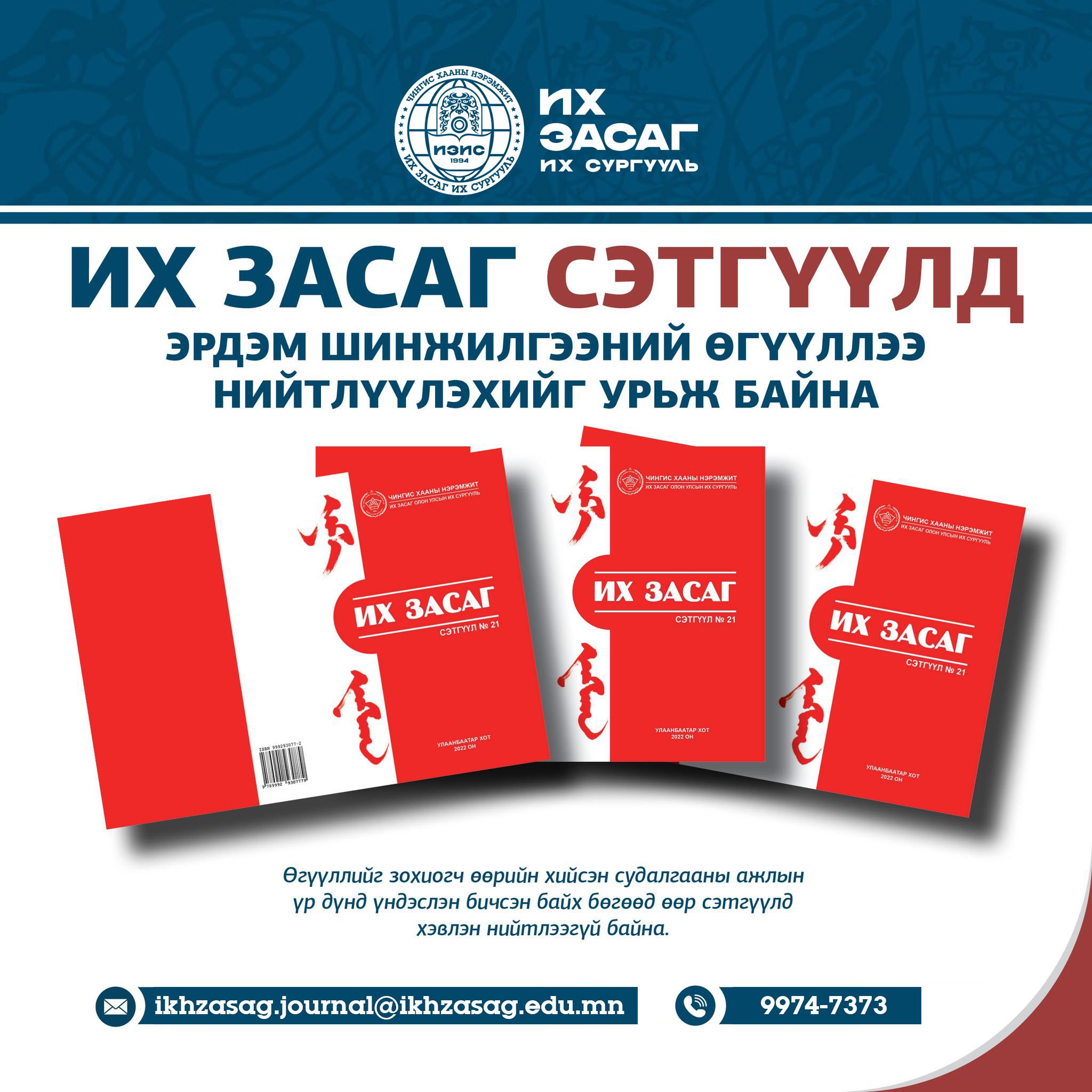 Чингис хааны нэрэмжит Их Засаг их сургуулиас эрхлэн гаргадаг “ИХ ЗАСАГ” онол, арга зүйн сэтгүүл нь олон улсын ISSN дугаартай, дотоодын эрдэм шинжилгээний хянан магадалгаа бүхий улирал тутмын сэтгүүл юм.