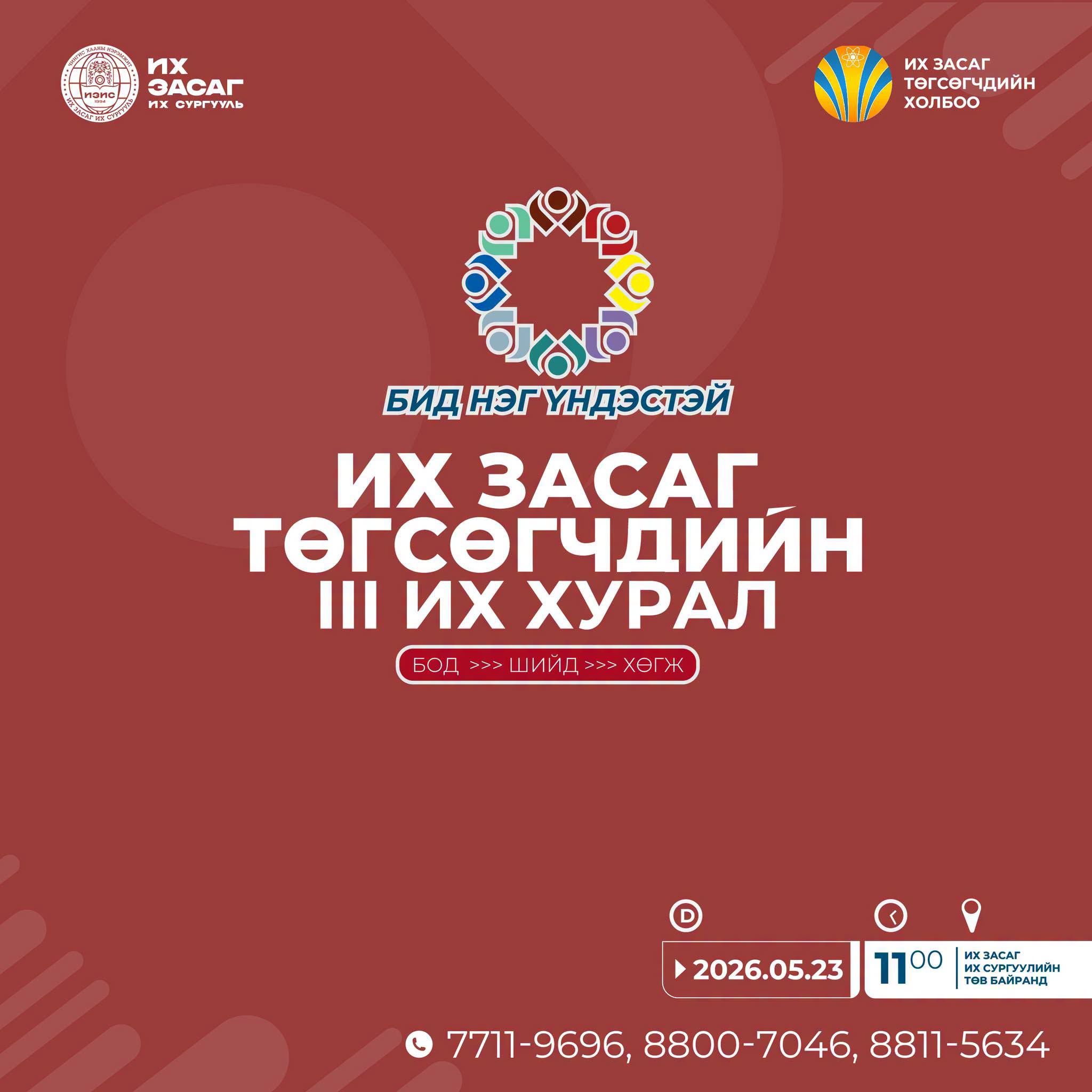 Чингис Хааны нэрэмжит Их Засаг их сургууль, Их Засаг төгсөгчдийн III их хурал 2026 оны 05 дугаар сарын 23-нд 11:ОО цагт Их Засаг их сургуулийн төв байранд болно.Их Засаг төгсөгч та бүхнийг хүрэлцэн ирэхийг урьж байна.#Их Засаг их сургуулийн захиргаа#Их Засаг төгсөгчдийн холбоо