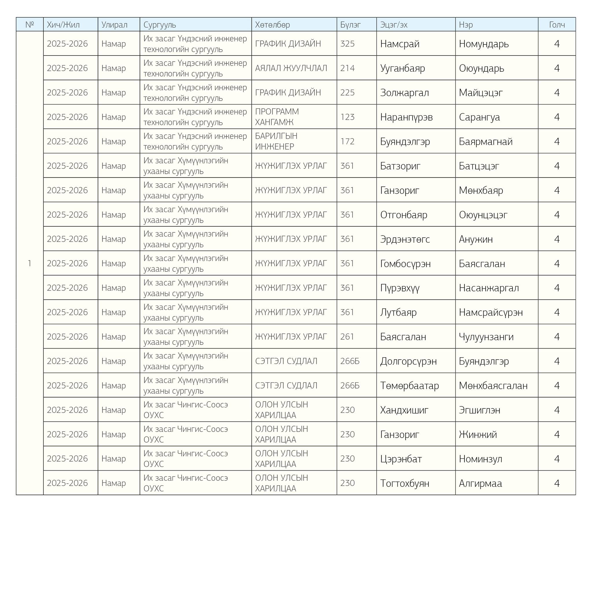 Их Засаг их сургуулийн 2025–2026 оны хичээлийн жилийн I улиралд сурлагын бахдам амжилтаараа хамт олноо хошуучлан манлайлж, “ШИЛДЭГ 500 ОЮУТАН”-ы нэгээр шалгарсан эрхэм хүндэт оюутнуудын эцэг эх, ах дүү, төрөл төрөгсөд Та бүхэнд чин сэтгэлийн баяр хүргэж байна.