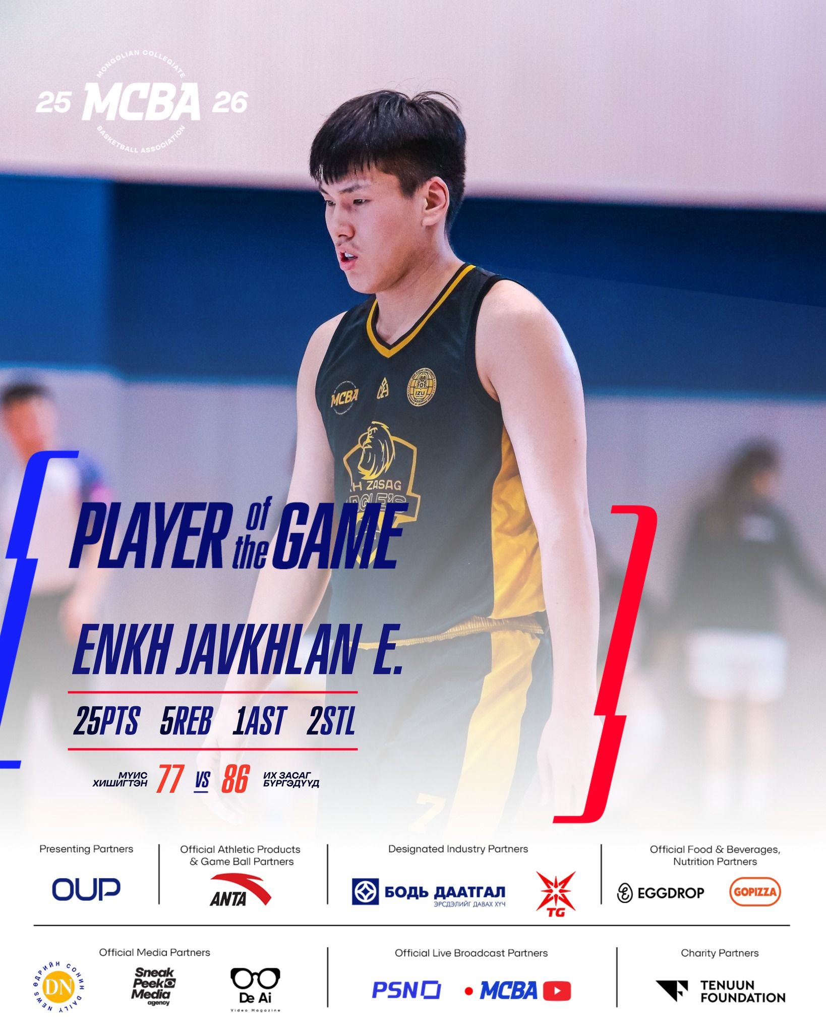 Тоглолтын турш тогтвортой, онцгой гүйцэтгэл үзүүлсэн ИХ ЗАСАГ БҮРГЭДҮҮД багийн тоглогч Э.ЭНХЖАВХЛАН PLAYER OF THE MATCH-аар тодорсон нь хөгжөөн дэмжигчдийн бахархлыг төрүүллээ.