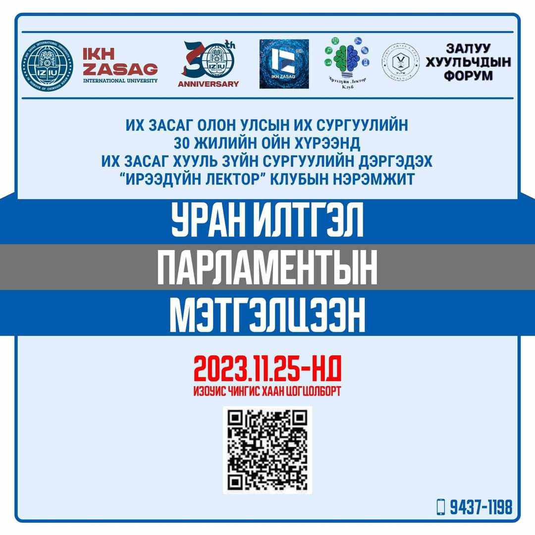 УРАН ИЛТГЭЛ, МЭТГЭЛЦЭЭНИЙ ТЭМЦЭЭНИХ ЗАСАГ ОЛОН УЛСЫН ИХ СУРГУУЛИЙН 30 ЖИЛИЙН ОЙГ УГТСАН ИХ ЗАСАГ ХУУЛЬ ЗҮЙН СУРГУУЛИЙН “ИРЭЭДҮЙН ЛЕКТОР” КЛУБИЙН НЭРЭМЖИТ “ХАРАХ ӨНЦӨГ” УРАН ИЛТГЭЛ, МЭТГЭЛЦЭЭНИЙ ТЭМЦЭЭНЗорилго: Оюутнуудын чөлөөт цагийг зөв боловсон өнгөрүүлэх, мэдлэгийн хүрээг тэлэх, ур чадварыг нэмэгдүүлэх, өөрийгөө зөв боловсон илэрхийлэх чадварыг дээшлүүлэх, хамтдаа хөгжихөд оршино. Зохион байгуулагч: Их засаг Хууль зүйн сургуулийн дэргэдэх “Ирээдүйн лектор” илтгэх урлаг, парламентын мэтгэлцээний клубХамтран зохион байгуулагч: “Залуу хуульчдын форум” ТББ“Их Засаг” телевизХамрах хүрээ: Бакалаврын түвшний 1- 5-р курсийн оюутнуудХаана: Уран илтгэл- Их засаг ОУИС-ийн Чингис Хаан цогцолборын “Event Hall”Мэтгэлцээн- Их засаг Хууль зүйн сургуулийн хичээлийн 1-р байрын 37 болон 40 тоот лекцийн заал. Хугацаа: 2023 оны 11 сарын 25-ны өдөр 11:00 цагБүртгэлийн хугацаа: 2023.10.27-наас 2023.11.23-ны өдрийг дуустал цахимаар явагдана. Бүртгэлийн хураамж: Уран илтгэл: 5,000 Мэтгэлцээн: 10,000 төгрөг Хаан банк- 5156134474 /Б. Даваамягмар/ Гүйлгээний утга- Багийн нэр, гишүүдийн нэрсЦахим хаяг: “Ирээдүйн лектор клуб”, ИЗХЗС-ийн пэйж хуудас Холбоо барих утас: 94371198