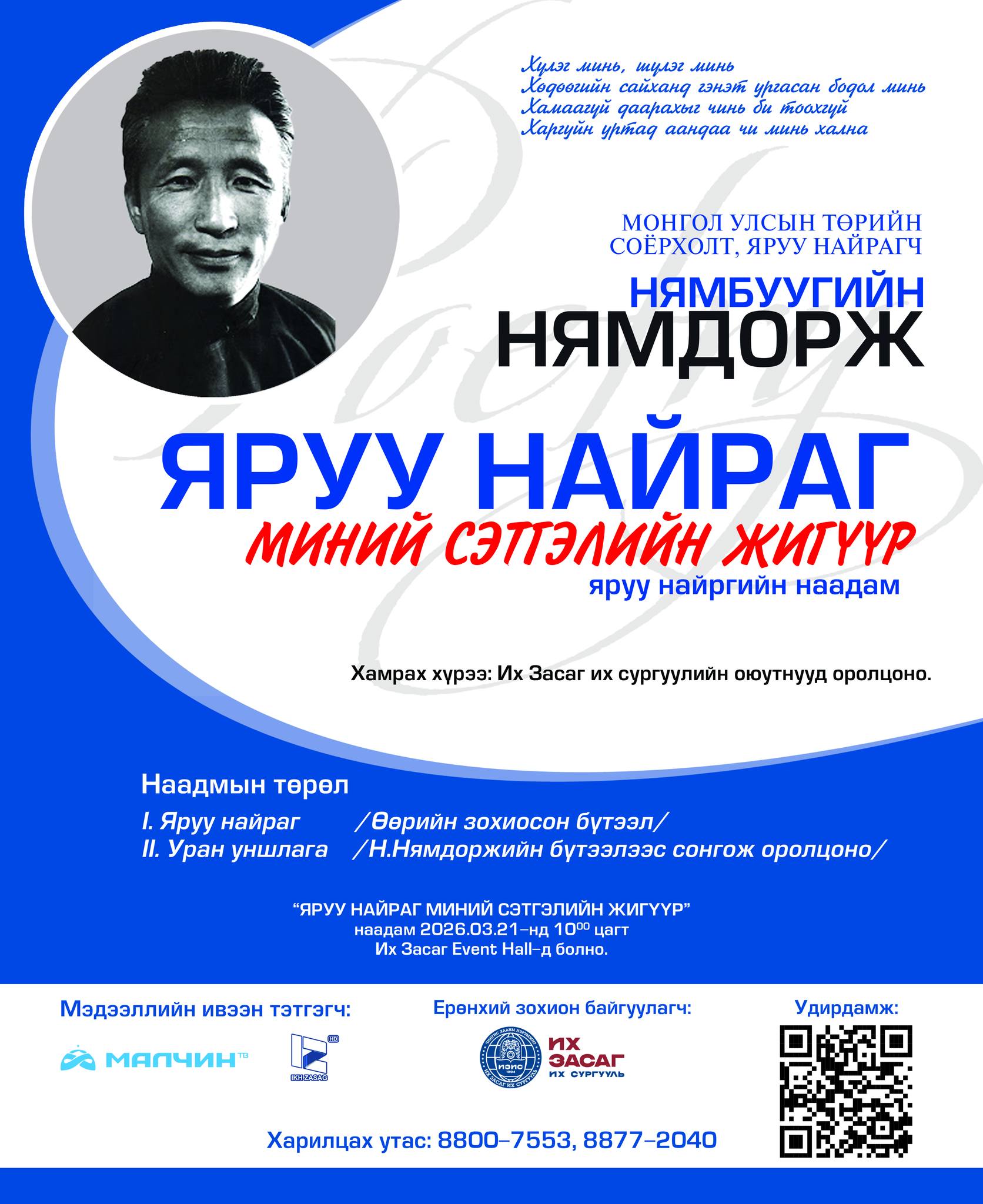 Дэлхийн яруу найргийн өдрийг тохиолдуулан Чингис хааны нэрэмжит Их Засаг их сургууль-аас жил бүр уламжлал болгон зохион байгуулдаг Монгол Улсын Төрийн Соёрхолт, яруу найрагч Нямбуугийн Нямдоржийн нэрэмжит “ЯРУУ НАЙРАГ – МИНИЙ СЭТГЭЛИЙН ЖИГҮҮР” яруу найргийн наадам 2026 оны 03 дугаар сарын 21-ний өдөр зохион байгуулагдах гэж байна.